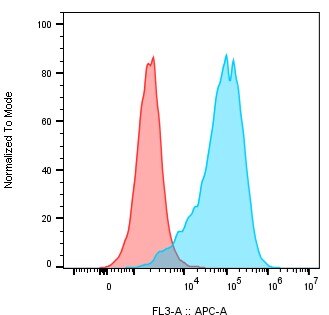 Detection of mouse TROP2 on the 4T1 breast cancer mouse cell line. 4T1 cells were treated with the Mouse TROP-2 Biotinylated antibody (catalog # BAF1122) (BLUE) or Normal Goat IgG biotinylated control antibody (catalog # BAF108) (RED), followed by streptavidin conjugated to APC.