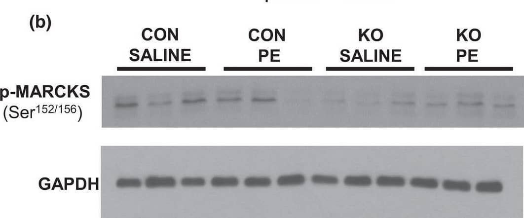 Detection of Phospho-MARCKS (S152/S156) by Western Blot Decreased protein kinase C (PKC) isoforms in crSTIM1−/− hearts. Immunoblots and densitometric analysis of PKC alpha (a) and MARCKS (b) phosphorylation in hearts isolated from control and crSTIM1−/− mice treated subcutaneously with either 15 min saline or phenylephrine. Protein expression is normalized to total protein and/or GAPDH. STIM1, stromal interaction molecule 1. *p < 0.05, **p < 0.01, versus age‐matched control (ANOVA/Tukey's post hoc), n = 3 per genotype. STIM1, stromal interaction molecule 1 Image collected and cropped by CiteAb from the following open publication (https://pubmed.ncbi.nlm.nih.gov/35179826), licensed under a CC-BY license. Not internally tested by R&D Systems.