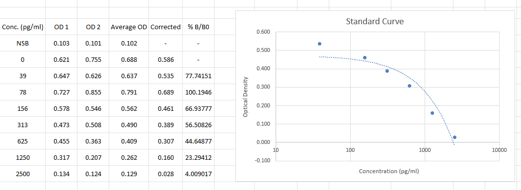 Unfortunately unable to produce a usable standard curve after multiple attempts. There was high variability between replicates as well as potential issues with binding based on OD readings even after repeating experiment and making sure to follow manufacturer's protocol exactly. Kit was easy to use however and instructions were very clear.