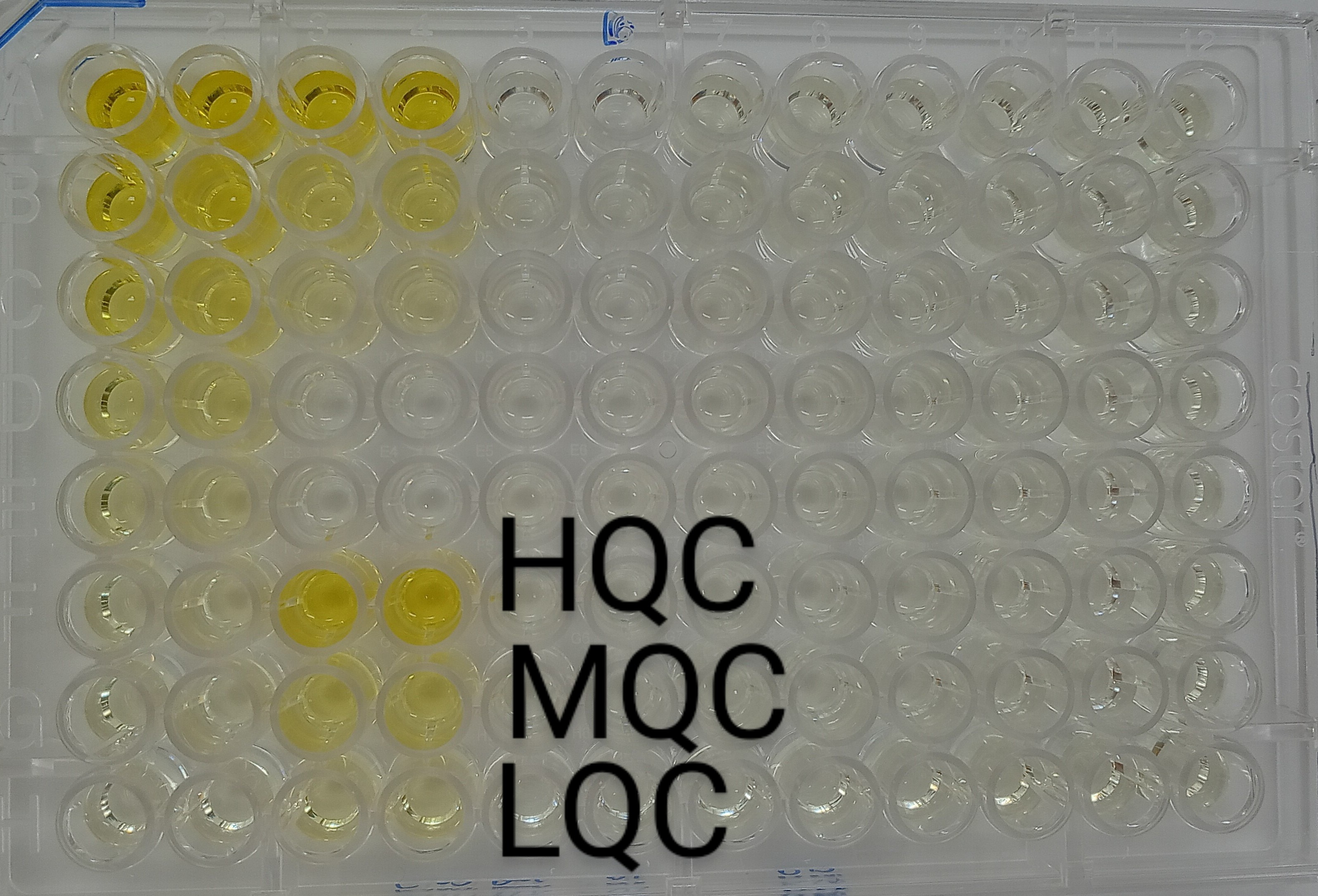 Used it for Huma serum samples. Ran in duplicate. HQC, MQC, LQC a s labelled in figure.