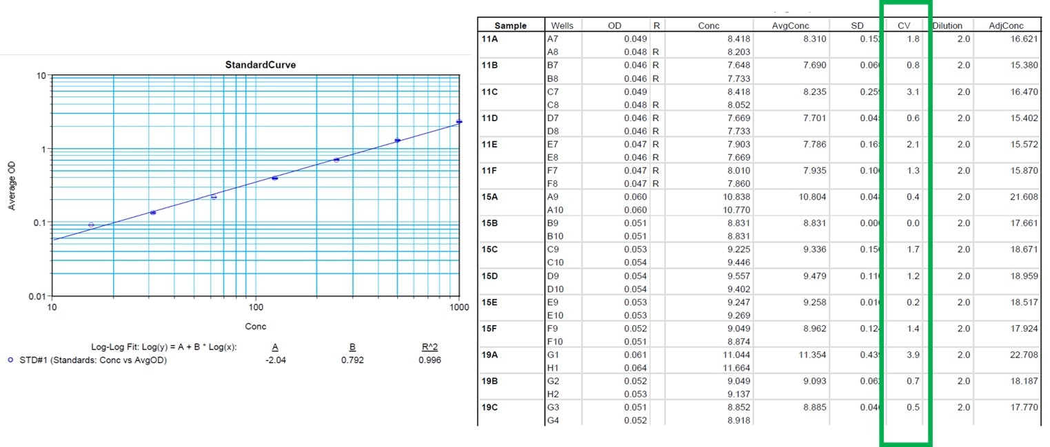 We tested IL-4 levels in a release assay performed in simulated body fluid. The standard curve was excellent and the CV values were all very low. We have used kits from other companies and found RnD systems kits to be superior to all other companies. The kits from RnD systems result in much lower background levels and much lower CV levels, which really helps with consistency and repeatability. The image shows the standard curve and the green outlines the low CV values.
