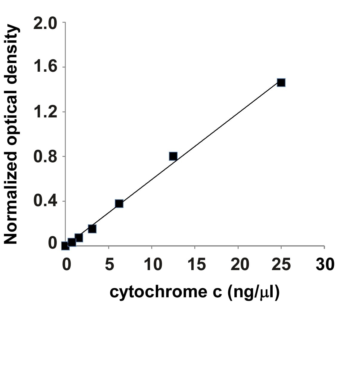 Cytochrome c is a small, highly conserved, heme-containing protein involved in mitochondrial electron transport. Cytochrome c is released from the mitochondria in response to pro-apoptotic stimuli and serves as a cofactor in initiating the activation of the APAF-1/Caspase-9 complex. The effect of specific proteins and/or small molecules on the initiation of the intrinsic apoptotic pathway can be evaluated in an in vitro system of isolated mitochondria by monitoring the release of cytochrome c.