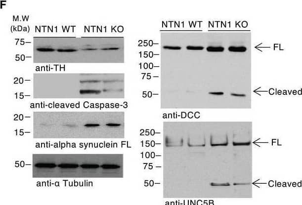 Detection of UNC5H2/UNC5B by Western Blot Netrin‐1 is reduced in the SN of PD patientsANetrin‐1 gene expression profiling by array of substantiae nigrae from PD and non‐PD (Control) patients using the GEO dataset GSE7621 that has a total of 25 samples (n = 9 control and n = 16 PD cases). Unpaired t‐test, ***P < 0.0005, Mean ± SD are shown.BImmunoblot of netrin‐1, DCC, UNC5B, active caspase‐3, alpha‐synuclein FL, alpha‐synuclein pS129, and tyrosine hydroxylase (TH) levels in age‐matched controls (n = 3) vs Parkinson’s disease patients brain samples (n = 3) (left panel). Band quantification bar graph (right panel). Bars and error bars represent the mean ± SEM. Statistical significance was determined using a one‐way ANOVA followed by post hoc Tukey test for multiple group comparison. **P < 0.01. N = 3 replicates.Source data are available online for this figure. Image collected and cropped by CiteAb from the following open publication (https://pubmed.ncbi.nlm.nih.gov/33351190), licensed under a CC-BY license. Not internally tested by R&D Systems.