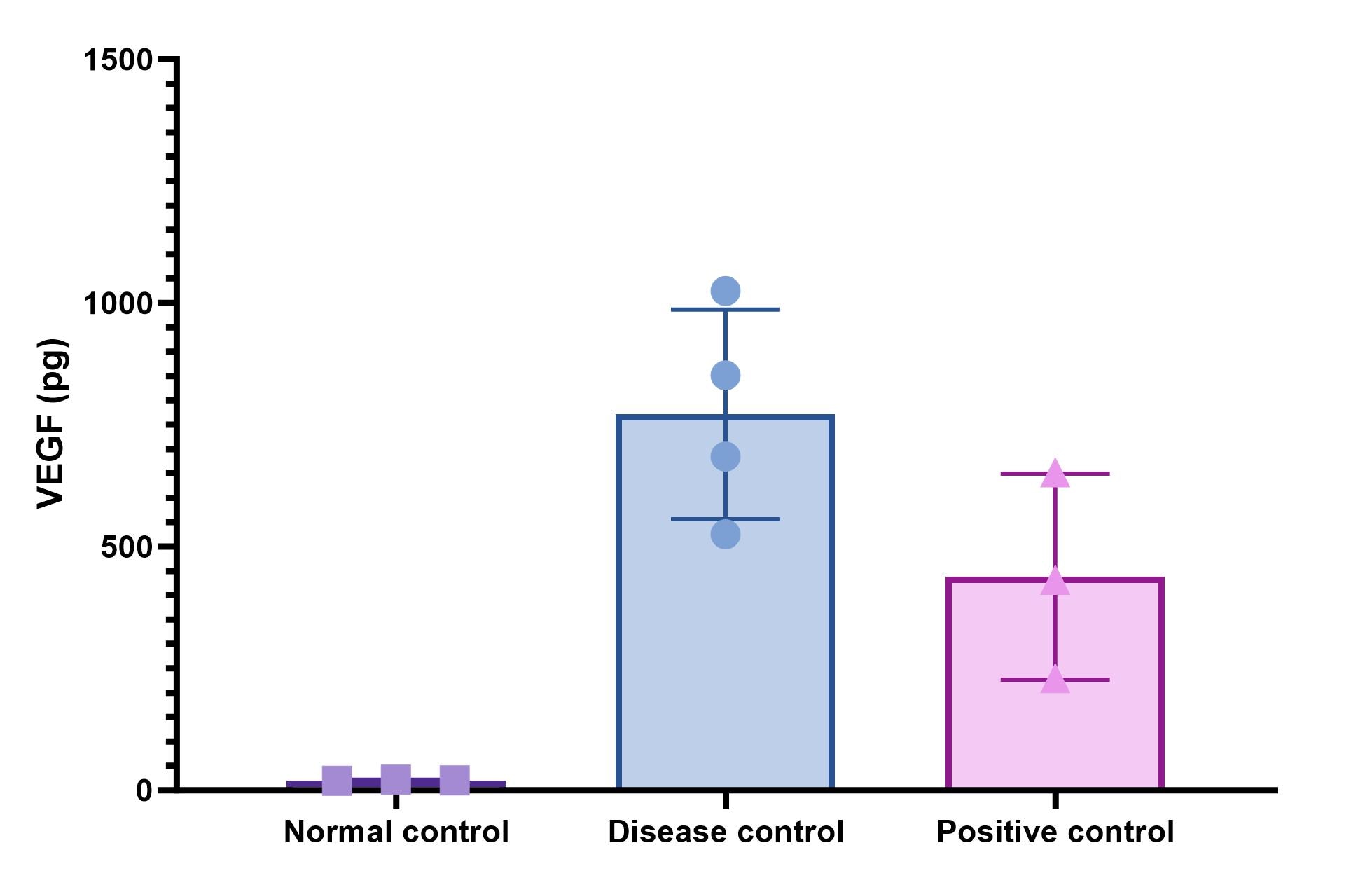 Vascular endothelial growth factor (VEGF or VEGF-A), also known as vascular permeability factor (VPF), is a potent mediator of both angiogenesis and vasculogenesis in the fetus and in adults (1-3). It is a member of the PDGF family that is characterized by the presence of eight conserved cysteine residues in a cystine knot structure and formation of anti-parallel disulfide-linked dimers (4). Alternately spliced isoforms of 120, 164, and 188 amino acids (aa) have been found in rats and mice, while 121, 145, 165, 183, 189, and 206 aa isoforms have been identified in humans (2, 4). In humans, VEGF165 appears to be the most abundant and potent isoform, followed by VEGF121 and VEGF189 (3, 4). The same pattern may exist in rats and mice. Isoforms other than VEGF120 and VEGF121 contain basic heparin-binding regions and are not freely diffusible (4). Rat VEGF164 shares 97% aa sequence identity with corresponding regions of mouse, 88% with human and bovine, 89% with porcine and canine, and 90% with feline and equine VEGF. VEGF is expressed in multiple cells and tissues including skeletal and cardiac muscle (5, 6), hepatocytes (7), osteoblasts (8), neutrophils (9), macrophages (10), keratinocytes (11), brown adipose tissue (12), CD34+ stem cells (13), endothelial cells (14), fibroblasts, and vascular smooth muscle cells (15). VEGF expression is induced by hypoxia and cytokines such as IL-1, IL-6, IL-8, Oncostatin M, and TNF-alpha (3, 4, 9). The isoforms are differentially expressed during development and in the adult (3).