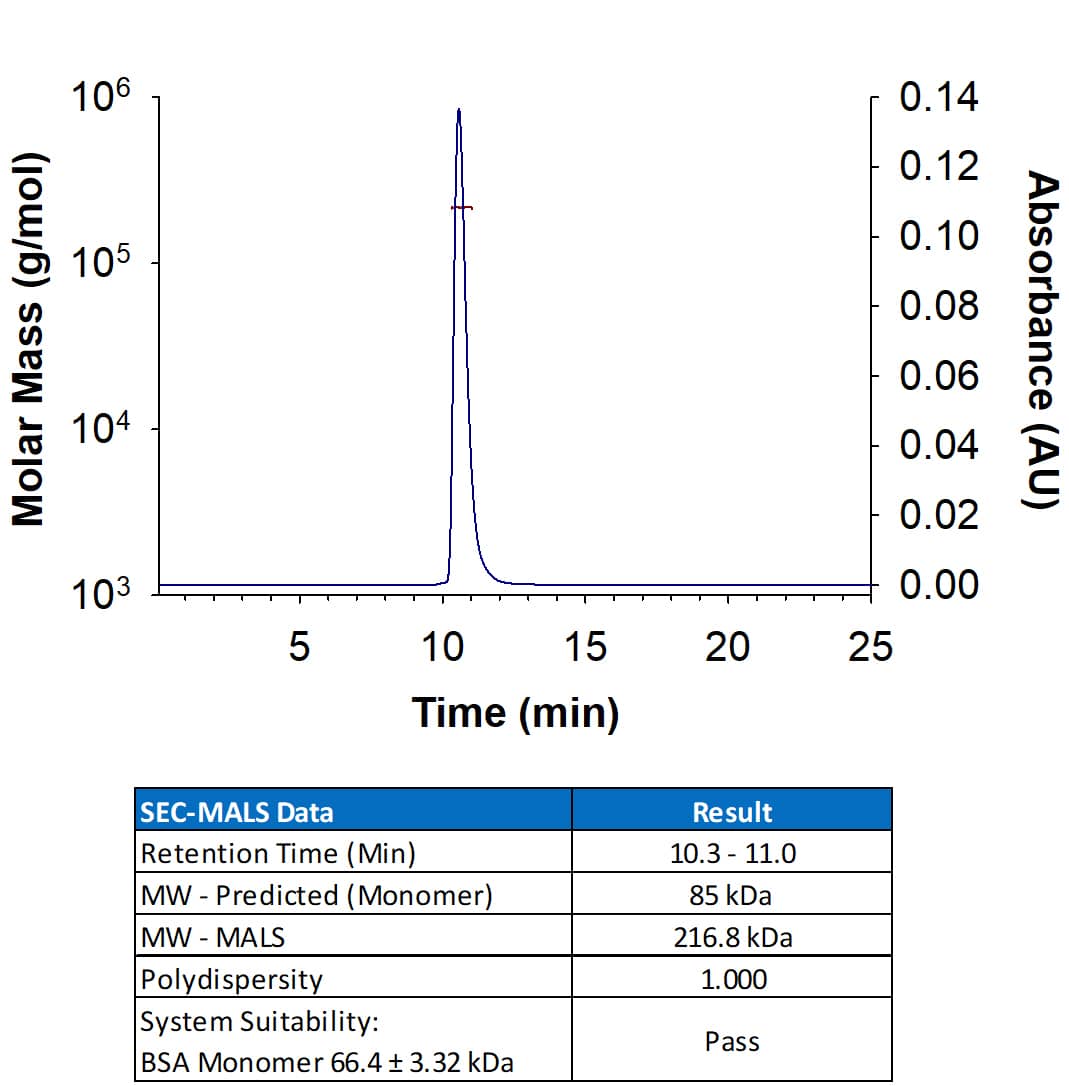 Recombinant Cynomolgus Monkey E‑Selectin/CD62E Fc Chimera Protein (Catalog # 11308-ES) has a molecular weight (MW) of 216.8 kDa as analyzed by SEC-MALS, suggesting that this protein is a homodimer. MW may differ from predicted MW due to post-translational modifications (PTMs) present (e.g. Glycosylation).