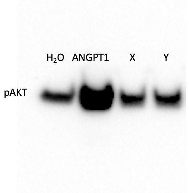 Reason for Rating: Worked well for my experiment. I used it to activate TIE2 and AKT in HUVEC. Lane 1 is control treated cells; Lane 2 is rh ANGPT1 (923-AN) treated cells. As can be seen, there is activation (phosphorylation) of AKT in the 923-AN treated cells.