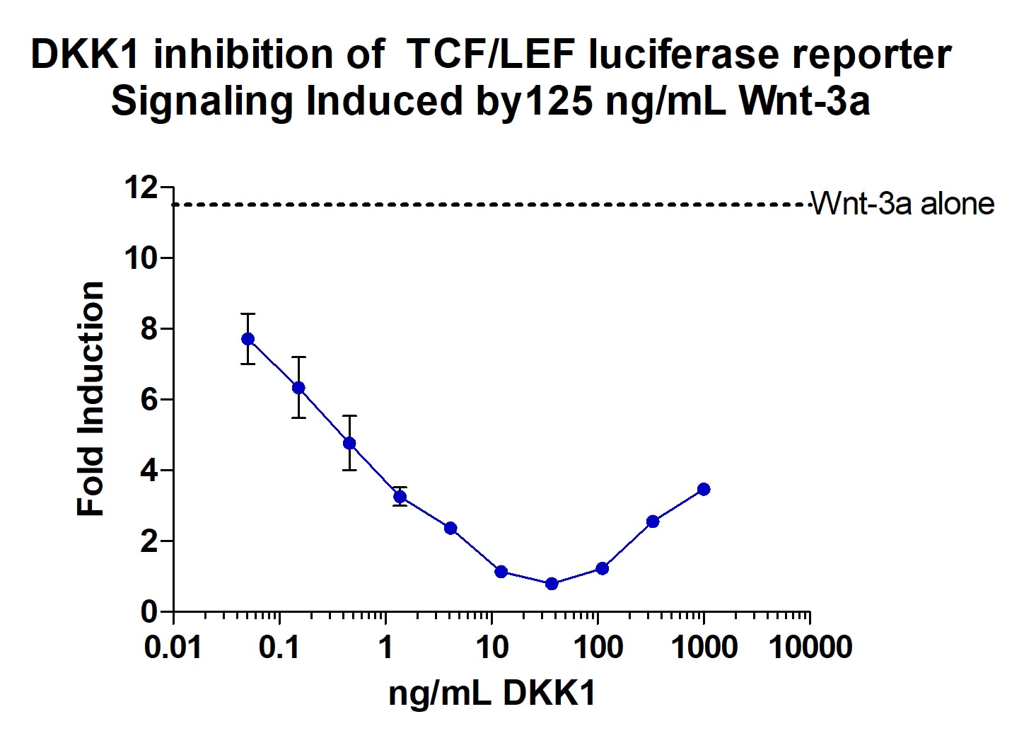 Recombinant Human Dkk‑1 (Catalog # 5439-DK) inhibits Wnt induced TCF reporter activity in HEK293 human embryonic kidney cells. The ED50 for this effect is 10.0-250 ng/mL.