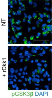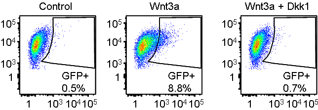 Recombinant Wnt3a (100 ng/mL) was added to cells containing a Wnt reporter (measured in eGFP) with or without RnD Dkk1 addition at 1 ug/mL