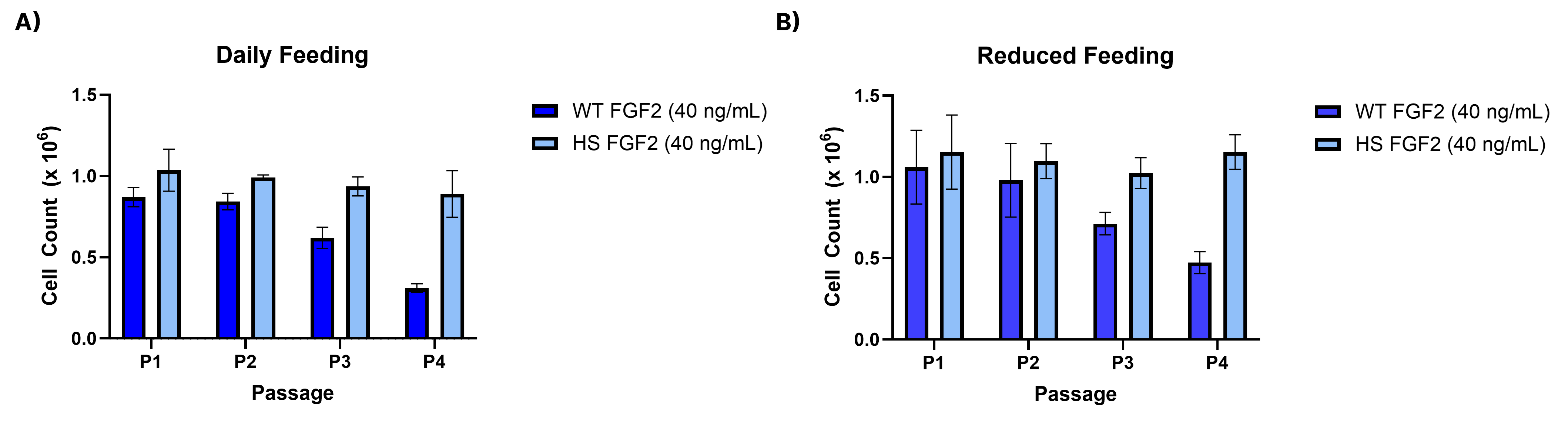 Human iPSCs were cultured for four passages in a commercial iPSC Expansion media containing 40 ng/mL of either rhFGFb Heat Stable (BT-FGFBHS) or wild type rhFGFb, Animal-Free (BT-FGFB-AFL). Media exchanges were performed following two feeding schedules. A). a daily feed schedule or B). a reduced feed schedule, where cells were double fed twice per week. Cells were plated at 5000 cells/cm2 in a 6-well dish coated with Cultrex Ultimatrix (BME001). For each schedule, all conditions were passaged once either group reached ~60-70% confluency and counts were performed using a Cellaca™ High-Throughput Cell Counter. Count of each passage is shown comparing WT vs HS FGFb in both the A) daily feed or B) reduced feed schedule.
