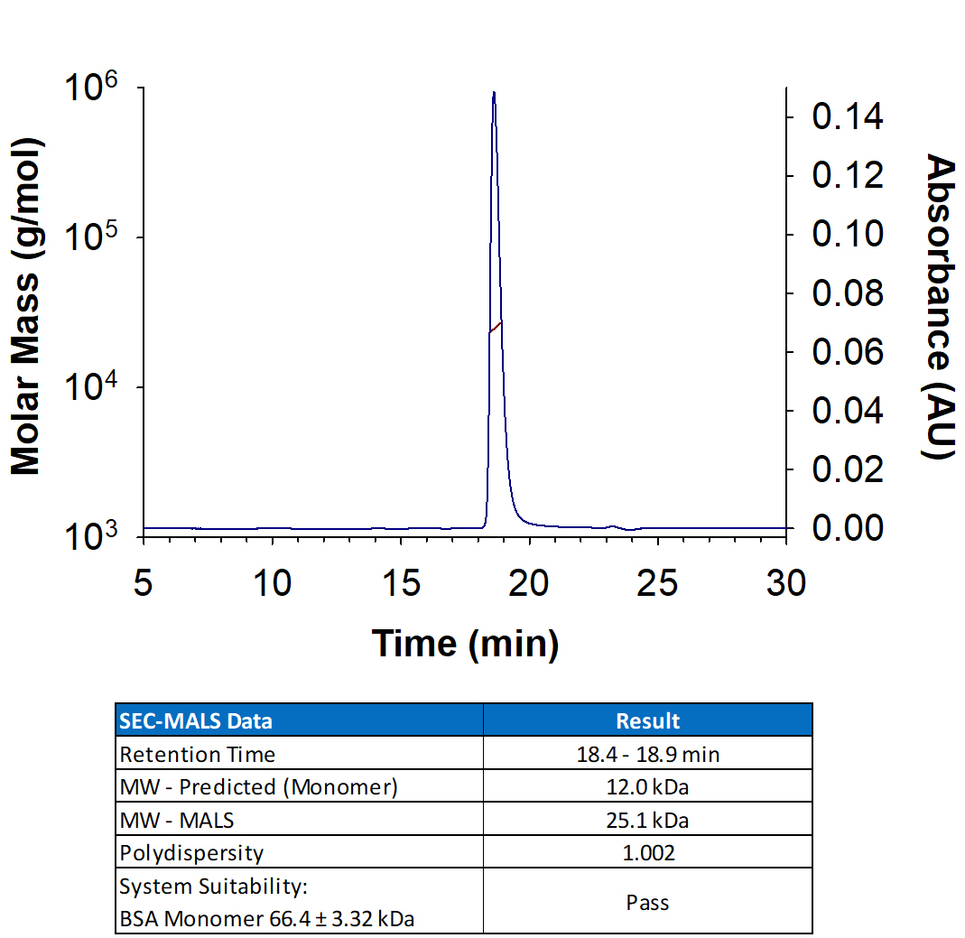 Recombinant Human GDF‑15 Protein (Catalog # 8146-GD) has a molecular weight (MW) of 24-26 kDa as analyzed by SEC-MALS, suggesting that this protein is a homodimer. MW may differ from predicted MW due to post-translational modifications (PTMs) present (i.e. Glycosylation).