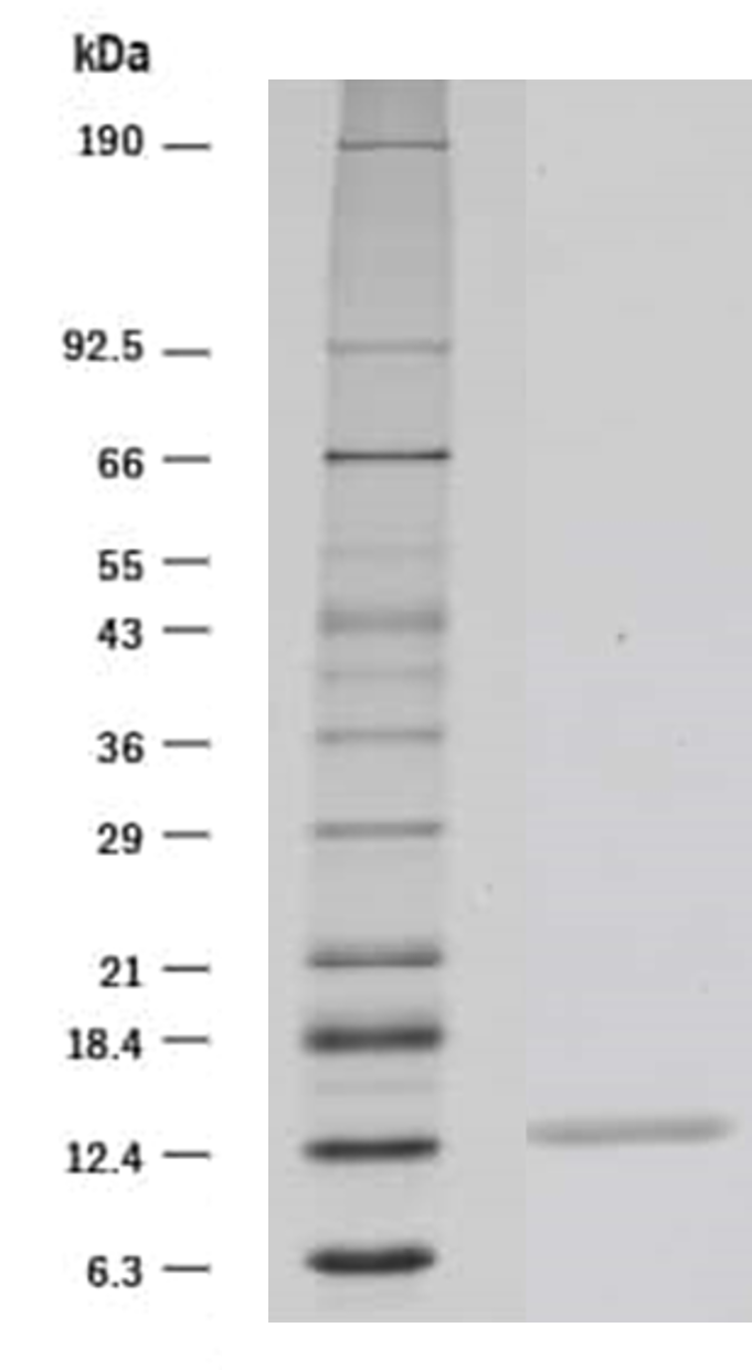 1 μg/lane of Recombinant Human GM-CSF was resolved with SDS-PAGE under reducing (R) conditions and visualized by silver staining, showing a single band at 14 kDa.