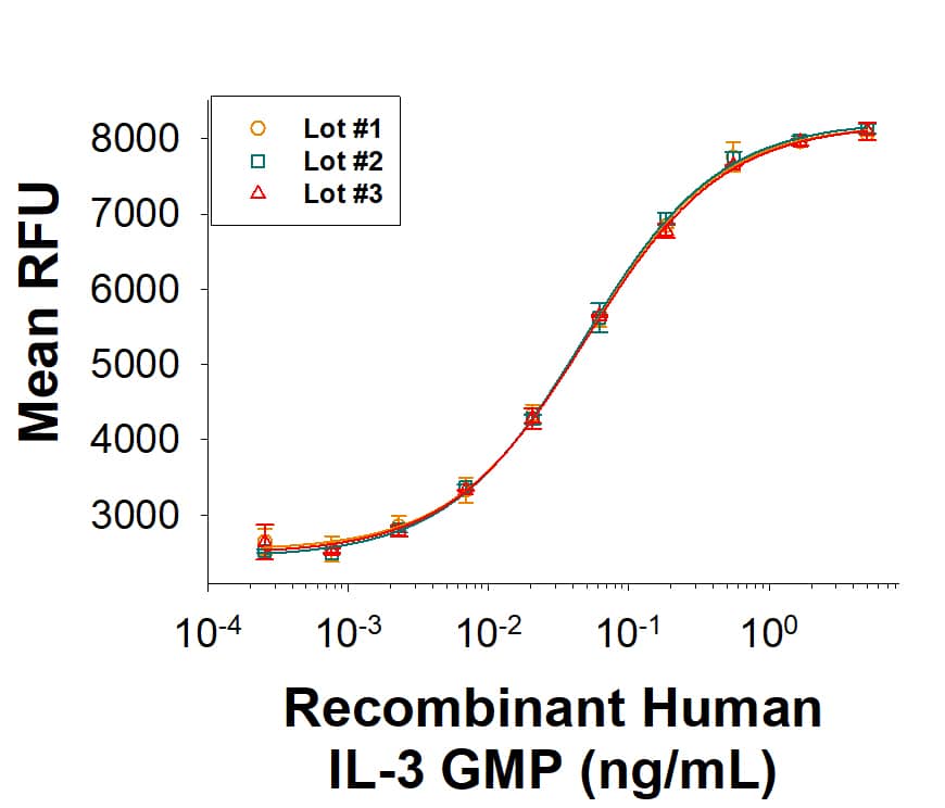 The bioactivity of Recombinant Human IL-3 GMP Protein (Catalog # BT-003-GMP) was measured in a cell proliferation assay using TF‑1 human erythroleukemic cells. Three independent lots were tested for bioactivity and plotted on the same graph to show lot-to-lot consistency of GMPIL-3 protein.