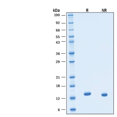 2 μg/lane of Recombinant Human IL‑3 GMP Protein (Catalog # BT-003-GMP) was resolved with SDS-PAGE under reducing (R) and non-reducing (NR) conditions and visualized by Coomassie® Blue staining, showing a band at 14 kDa under reducing conditions.