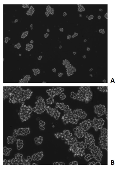 Growth of MA-11 spheroids in serum-free condition in the absence (A) or presence (B) of Recombinant Human LIF (#7734-LF) after 72 hours. Medium: RPMI + 2% B-27 supplement + 1% L-glutamine + 1% Pen/Strep.