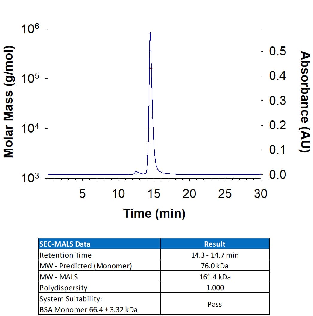 Recombinant Human TfR (Transferrin R) Protein (Catalog # 2474-TR) has a molecular weight (MW) of 153-169 kDa as analyzed by SEC-MALS, suggesting that this protein is a homodimer. MW may differ from predicted MW due to post-translational modifications (PTMs) present (i.e. Glycosylation).