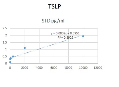 We used this protein in an in-house ELISA along with mAb (1398) and pAb (AF1398) to quantify TSLP in human serum and plasma. This combination could not detect TSLP samples but generated a good standard curve.