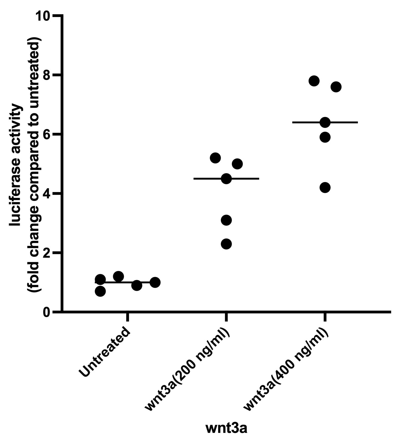 Use the final concentration that is recommended, don't make the final concentration very low. Hek293SFT cells were treated with different concentrations of wnt3a, and topflash assay was performed to detect the luciferase activity of wnt3a.