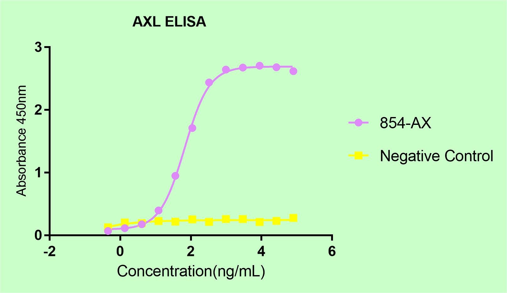 Axl (Ufo, Ark), Dtk (Sky, Tyro3, Rse, Brt), and Mer (human and mouse homologues of chicken c-Eyk) constitute a subfamily of the receptor tyrosine kinases (1, 2). The extracellular domains of these proteins contain two Ig‑like motifs and two fibronectin type III motifs. This characteristic topology is also found in neural cell adhesion molecules and in receptor tyrosine phosphatases. The mouse Axl cDNA encodes an 888 amino acid (aa) precursor that includes an 18 aa signal sequence, a 427 aa extracellular domain, a 21 aa transmembrane segment, and a 422 aa cytoplasmic domain. The extracellular domains of mouse and human Axl share 81% aa sequence identity. These receptors bind the vitamin K-dependent protein growth arrest specific gene 6 (Gas6) which is structurally related to the anticoagulation factor protein S. Binding of Gas6 induces receptor autophosphorylation and downstream signaling pathways that can lead to cell proliferation, migration, or the prevention of apoptosis (3). This family of tyrosine kinase receptors is involved in hematopoiesis, embryonic development, tumorigenesis, and regulation of testicular functions.
