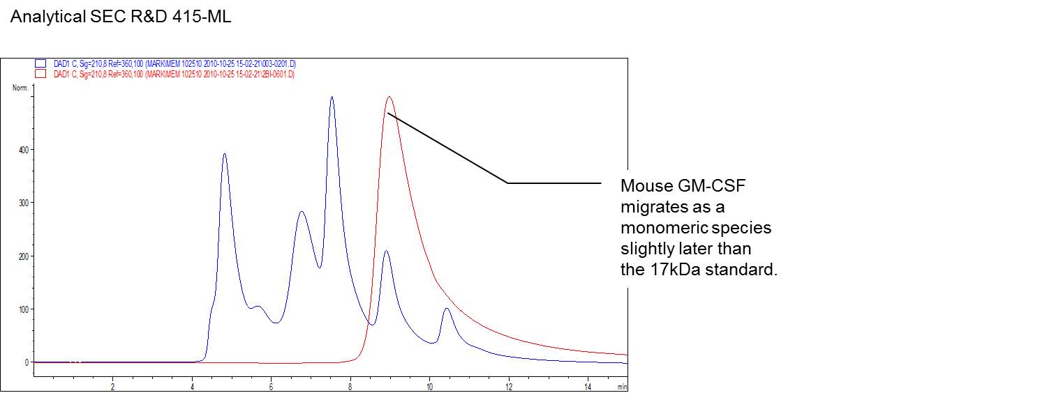 Recombinant Mouse GM-CSF Protein (Catalog # 415-ML) has a molecular weight (MW) of 14.3 kDa as analyzed by SEC-MALS, suggesting that this protein is a monomer.