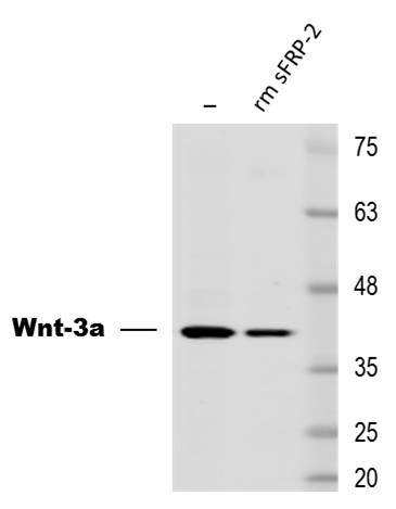 Downregulation of Wnt-3a in B-16 Murine melanoma cells upon treatment with 200 ng/mL of rm sFRP-2 (#1169-FR). PVDF membrane. Anti-Mouse Wnt-3a at 1:1,000 dilution, secondary antibody at 1:1,000 dilution.