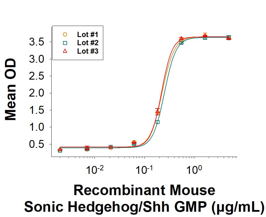 The bioactivity of Recombinant Mouse Sonic Hedgehog/Shh GMP Protein (Catalog # BT-SHH-GMP) was measured in the alkaline phosphatase production using C3H10T1/2 mouse embryonic fibroblast cells. Three independent lots were tested for bioactivity and plotted on the same graph to show lot-to-lot consistency of GMP Sonic Hedgehog/Shh protein.