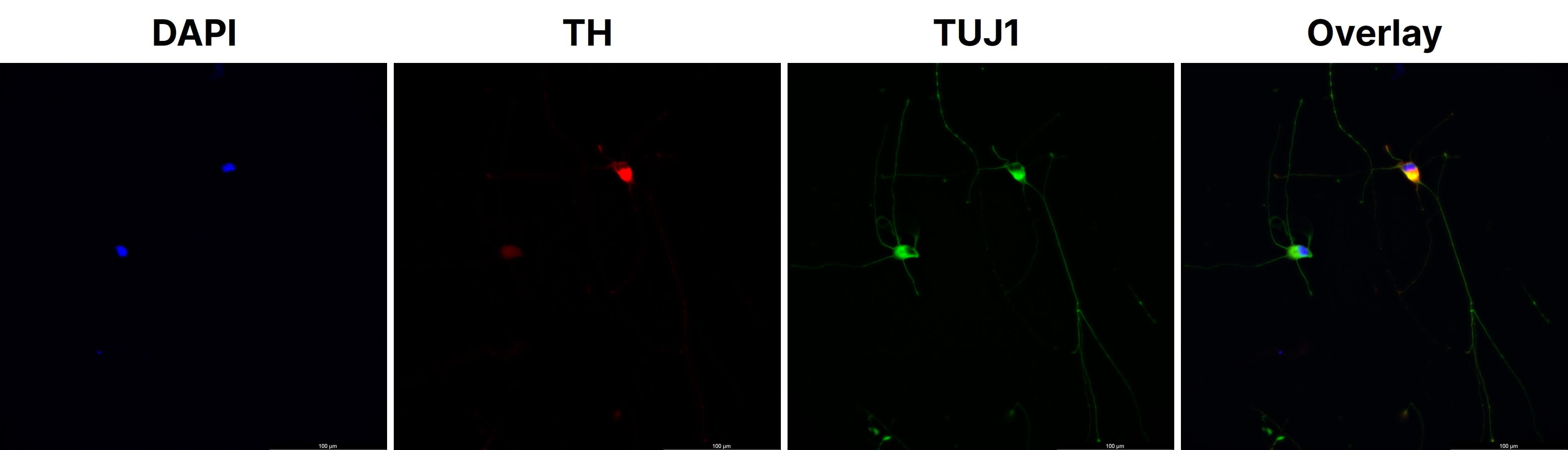 Representative immunofluorescent staining of cells for characteristic markers of neuronal lineage. Following differentiation using Recombinant Mouse Sonic Hedgehog/Shh GMP Protein (Catalog # BT-SHH-GMP), the iPSC-derived dopaminergic neurons were fixed and stained with DAPI (Catalog # 5748), anti-TH (Catalog # AF7566), and anti-TUJ1 (Catalog # MAB1195), followed by secondary antibody staining with anti-mouse IgG Alexa Fluor 488 conjugated antibody and anti-sheep IgG NorthernLights NL557-Conjugated Antibody (Catalog # NL010).