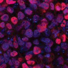 View Larger Image | Differentiation of Pluripotent Stem Cells into Mesoderm. BG01V human embryonic stem cells were differentiated into mesoderm using the media supplements included in this kit. To evaluate lineage commitment, the cells were stained with the Goat Anti-Human Brachyury Antibody included. The cells were stained using the NorthernLights 557-conjugated Donkey anti-Goat IgG Secondary Antibody (Catalog # NL001; red), and the nuclei were counterstained with DAPI (blue). |