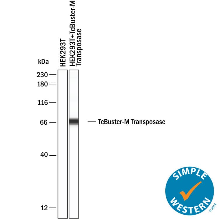 Detection of TcBuster-M Transposase by Simple WesternTM. Simple Western shows lysates HEK293T human embryonic kidney cell line mock electroporated or electroporated with 1µg TcBuster-M Transposase after 1 day post-electroporation, loaded at 0.5 mg/ml. A specific band was detected for TcBuster-M Transposase at approximately 71 kDa (as indicated) using 20 µg/mL of Mouse Anti-TcBuster-M Transposase Monoclonal Antibody (Catalog # MAB11511). This experiment was conducted under reducing conditions and using the 12‑230 kDa separation system.