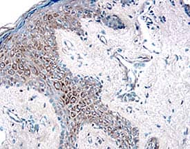 Hepatocyte Growth Factor Receptor (HGF R)/c-MET) was detected in immersion fixed paraffin-embedded sections of human skin using Human HGF R Antigen Affinity-purified Polyclonal Antibody (Catalog # AF276) at 15 µg/mL overnight at 4 °C. Tissue was stained using the Anti-Goat HRP-DAB Cell & Tissue Staining Kit (brown; Catalog # CTS008) and counterstained with hematoxylin (blue). View our protocol for Chromogenic IHC Staining of Paraffin-embedded Tissue Sections.