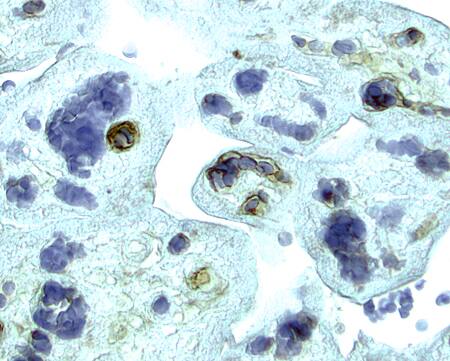 Vascular endothelial cell growth factor receptor 2 (VEGF R2)/KDR/Flk-1 was detected in immersion fixed paraffin-embedded sections of human placenta using Human VEGF R2 Monoclonal Antibody (Catalog # MAB3571) at 25 µg/mL overnight at 4 °C. Tissue was stained using the Anti-Mouse HRP-DAB Cell & Tissue Staining Kit (brown; Catalog # CTS002) and counterstained with hematoxylin (blue). View our protocol for Chromogenic IHC Staining of Paraffin-embedded Tissue Sections.