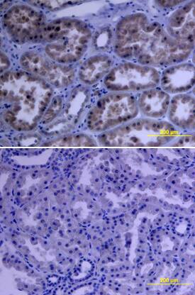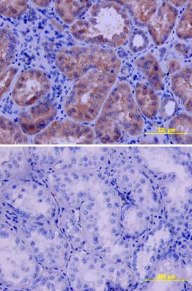 Vascular Endothelial Growth Factor Receptor 2 (VEGF R2/KDR/Flk-1) was detected in immersion fixed paraffin-embedded sections of human kidney using Human VEGF R2/KDR/Flk-1 Antigen Affinity-purified Polyclonal Antibody (Catalog # AF357) at 10 µg/mL overnight at 4 °C. Tissue was stained using the Anti-Goat HRP-DAB Cell & Tissue Staining Kit (brown; Catalog # CTS008) and counterstained with hematoxylin (blue). Lower panel shows a lack of labeling if primary antibodies are omitted and tissue is stained only with secondary antibody followed by incubation with detection reagents. View our protocol for Chromogenic IHC Staining of Paraffin-embedded Tissue Sections.