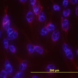 Vascular Endothelial Growth Factor Receptor 2 (VEGF R2)/KDR/Flk-1 was detected in immersion fixed bEnd.3 mouse endothelioma cell line using Mouse VEGF R2 Monoclonal Antibody (Catalog # MAB4432) at 10 µg/mL for 3 hours at room temperature. Cells were stained using the NorthernLights™ 557-conjugated Anti-Rat IgG Secondary Antibody (red; Catalog # NL013) and counterstained with DAPI (blue). View our protocol for Fluorescent ICC Staining of Cells on Coverslips.