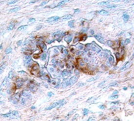 Vascular Endothelial Growth Factor Receptor 3 (VEGF R3)/Flt-4 was detected in immersion fixed paraffin-embedded sections of human uterine cancer tissue using Human VEGF R3 Antigen Affinity-purified Polyclonal Antibody (Catalog # AF349) at 15 µg/mL overnight at 4 °C. Tissue was stained using the Anti-Goat HRP-DAB Cell & Tissue Staining Kit (brown; Catalog # CTS008) and counterstained with hematoxylin (blue). Specific labeling was localized to the cytoplasm of glandular epithelial cells. View our protocol for Chromogenic IHC Staining of Paraffin-embedded Tissue Sections.