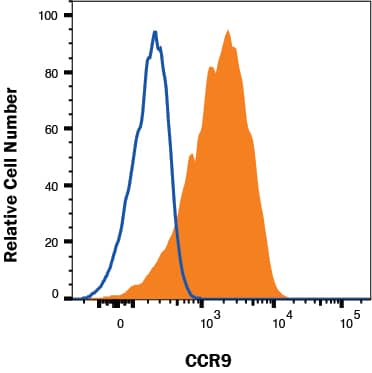 CCR9 is a G protein-coupled receptor member of the CC chemokine subfamily of receptors. Human CCR9 is 369 amino acids (aa) in length with a predicted molecular weight of 42 kDa. Mouse and rat CCR9 share 86% aa sequence identity with the human protein. Most chemokine receptors exhibit promiscuous binding properties whereby several different chemokines signal through the same receptor. Chemokine ligand receptor binding results in G protein activation as well as the activation of downstream signaling cascades, including the Akt and NFkB pathways. Chemokine receptors mediate the chemotactic actions of chemokine ligands and activation of these receptors leads to cytoskeleton rearrangement and chemotactic cell migration.