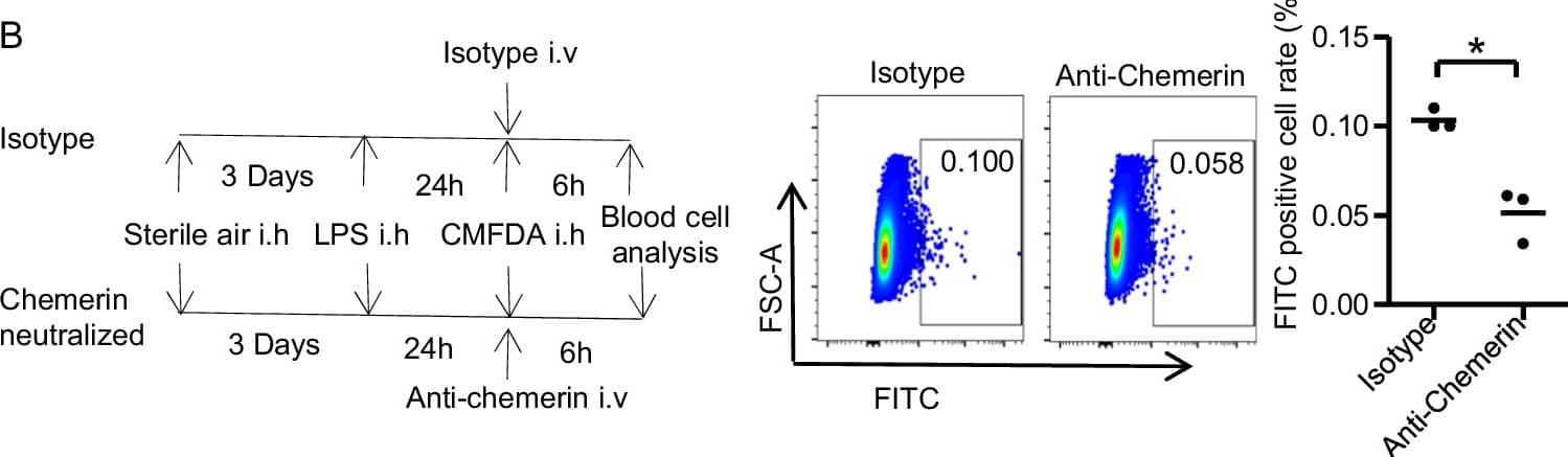 Chemerin, also known as Tazarotene-induced Gene 2, (Tig-2), is a member of the Cystatin superfamily. Chemerin is synthesized as a 163 aa precursor that contains a hydrophobic 20 aa N-terminal sequence, an intervening 137 aa Cystatin fold-containing domain, and a six aa C-terminal prosegment. It is activated by proteases of the coagulation, fibrinolytic, and inflammatory cascades. Chemerin is a chemoattractant for cells bearing the Chem R23 receptor, including plasmacytoid dendritic cells and tissue macrophages.
