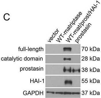HAI-1 is a Kunitz-type serine protease inhibitor, identified as a strong inhibitor of HGF activator (HGFA) and matriptase. The membrane-anchored HAI-1 consists of two Kunitz domains, a LDL-receptor-like domain, and a C-terminal transmembrane domain. Two soluble forms are generated by ectodomain shedding, one with a single Kunitz domain and the other with two Kunitz domains. HAI-1 is not only an inhibitor but also a specific receptor of active HGFA, acting as a reservoir of this enzyme on the cell surface.