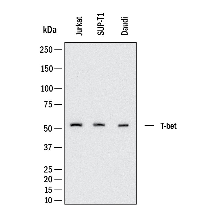 T-box expressed in T cells (T-bet), also known as T-box transcription factor TBX21, is a 62 kDa member of the T-box family of transcription factors and the Tbr1 subfamily. Human T-bet is 535 amino acids in length and contains a T-box DNA binding domain (aa 136-327). Human T-bet shares 88% aa sequence identity with mouse ...